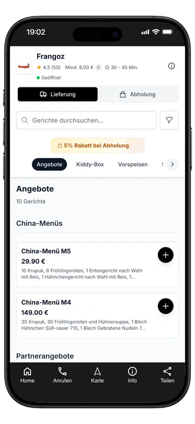 10 Krupuk, 6 Frühlingsrollen, 1 Entengericht nach Wahl mit Reis, 1 Hähnchengericht nach Wahl mit Reis, 1 Softdrink 1,0l